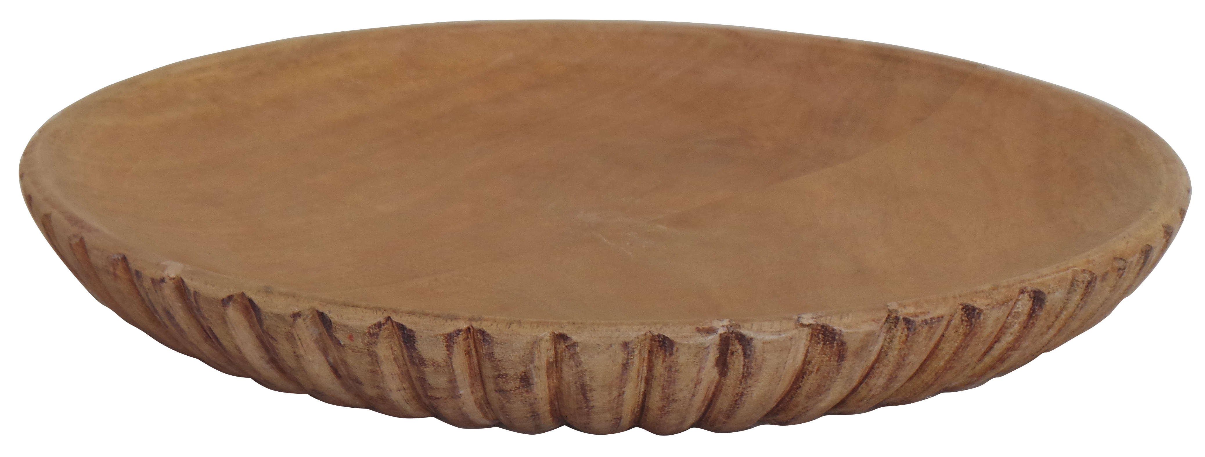 Большая круглая тарелка выполнена вручную из массива манго, отличается натуральным оттенком. Подходит для подачи основных блюд или закусок для компании.