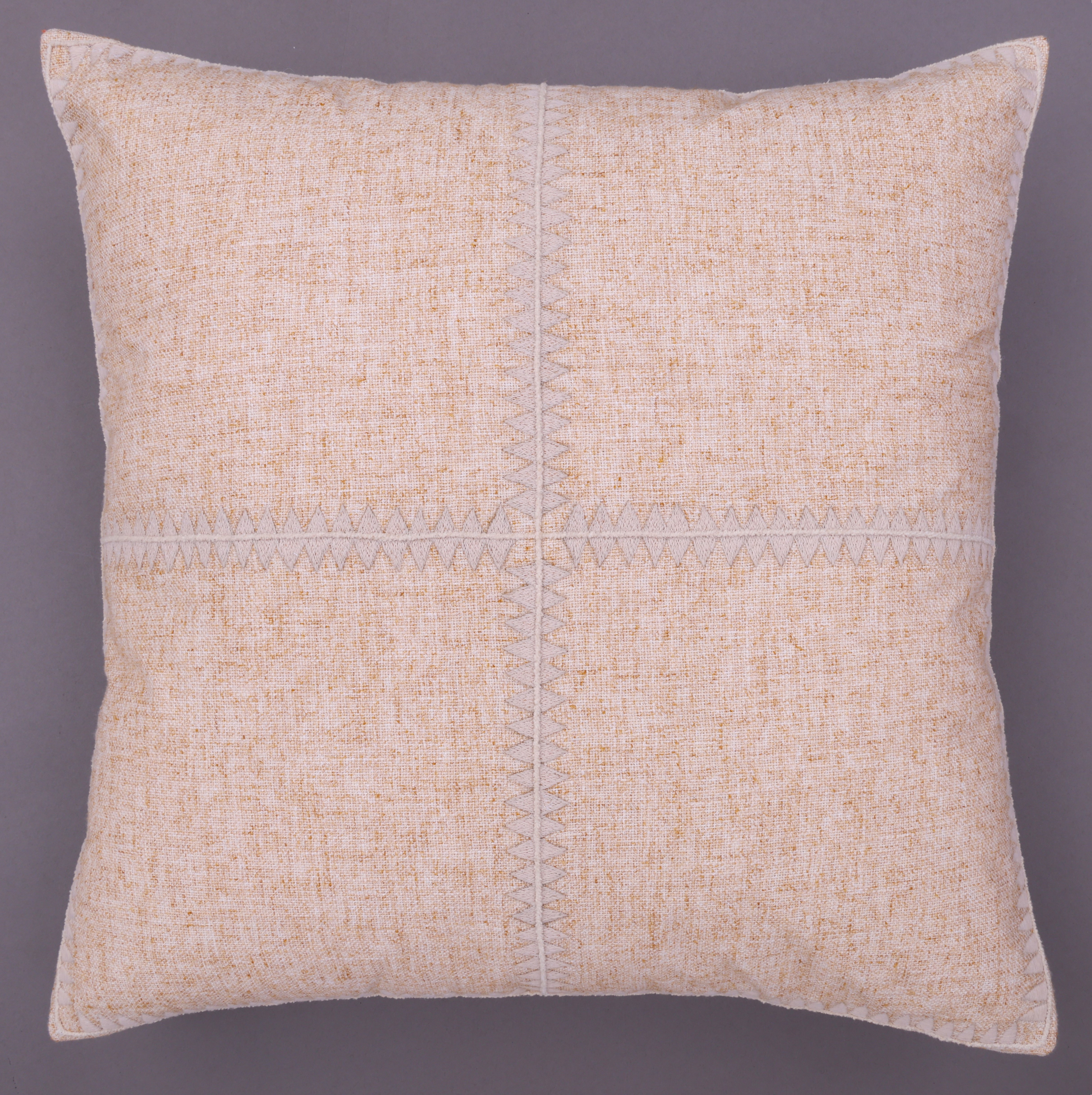 Наволочка выполнена из смеси полиэстера, хлопка и льна на лицевой стороне и хлопковой ткани с обратной стороны, что обеспечивает сочетание фактуры и прочности. Вышитый рисунок добавляет декоративный акцент. Застёжка-молния и внутренняя прокладка из нетканого материала обеспечивают удобство и сохранение формы.