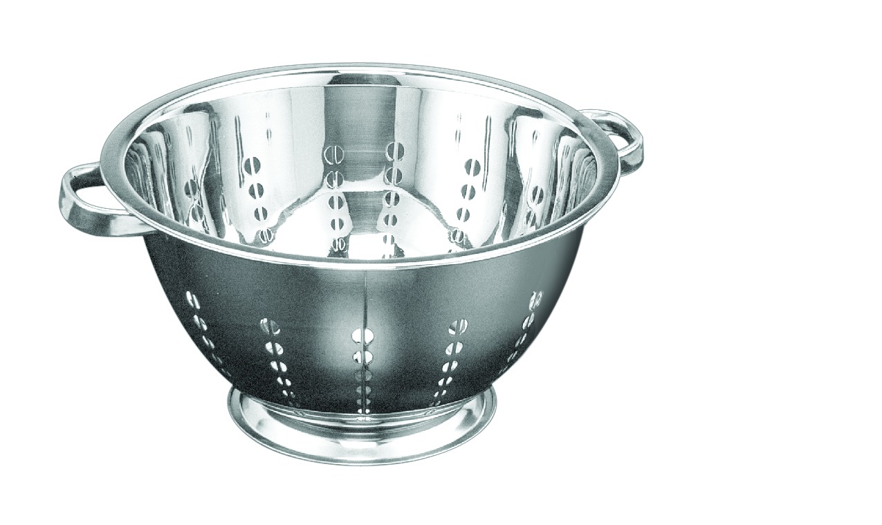 Глубокий дуршлаг из нержавеющей стали с полированной поверхностью. Материал обеспечивает долговечность и простоту ухода.