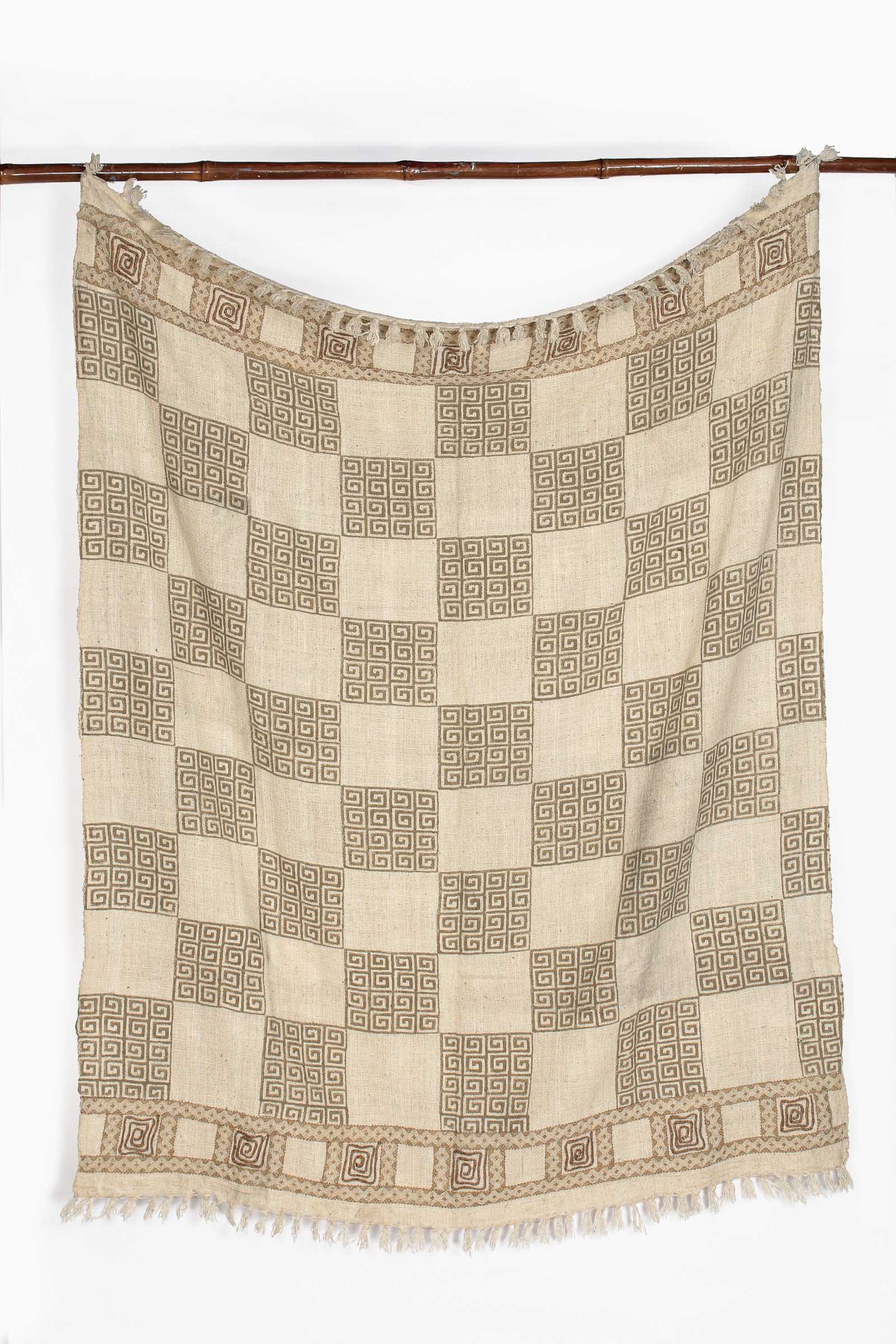 Плед из 100% хлопка с ручным блоковым принтом и бахромой по краям.
