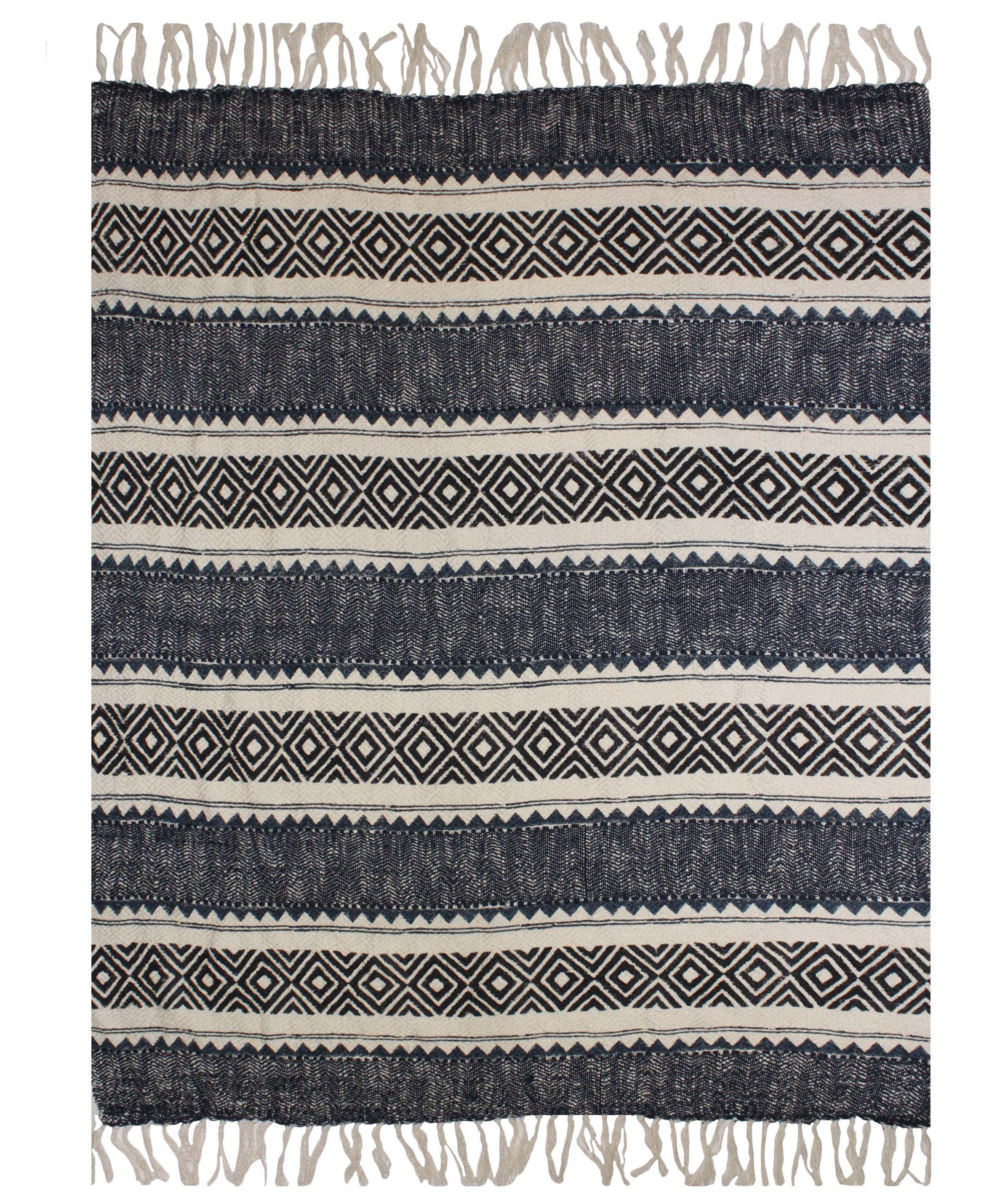 Плед из хлопка кади с ручным блоковым принтом и бахромой по краям.