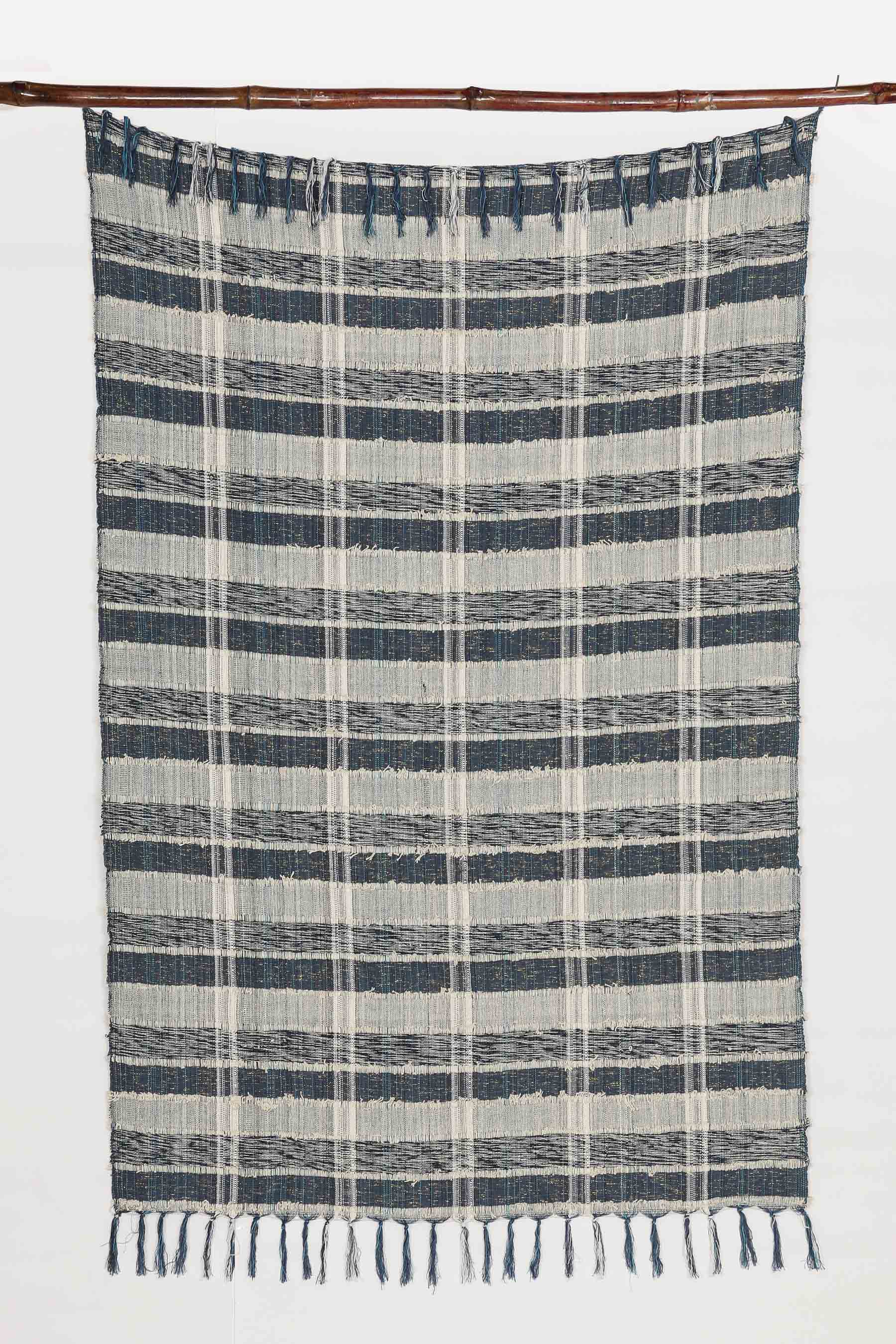 Плед из 100% хлопка с плетеной поверхностью и бахромой по краям.