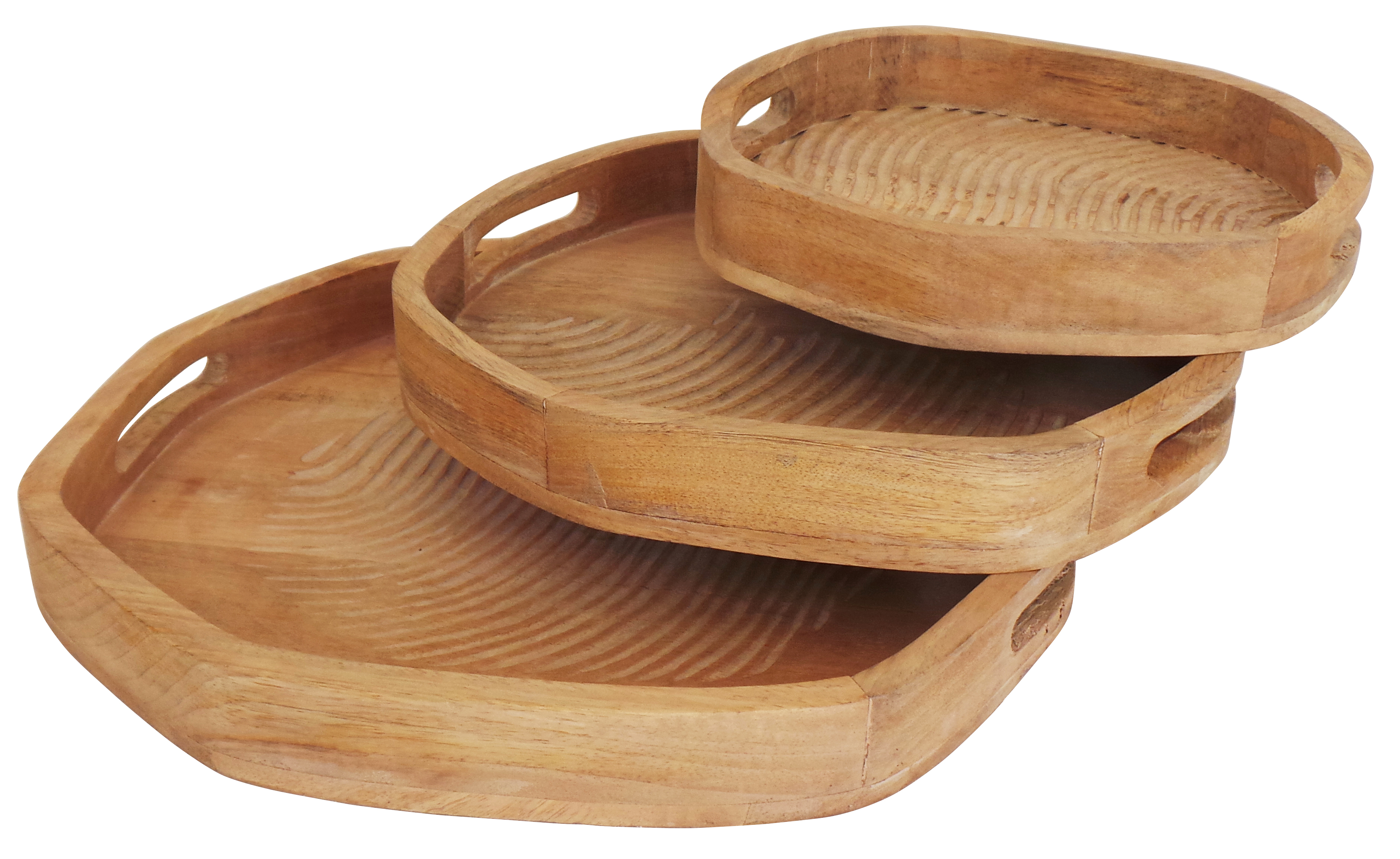 Набор из трёх подносов изготовлен вручную из массива манго, имеет органичную форму и натуральный оттенок. Подходит для разных задач сервировки и подачи.