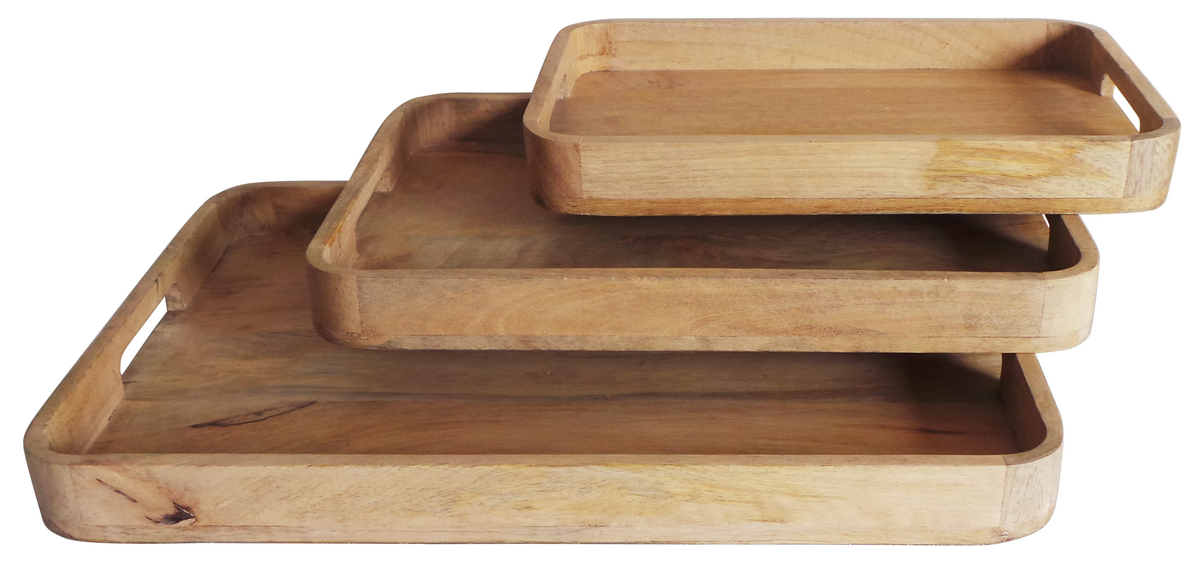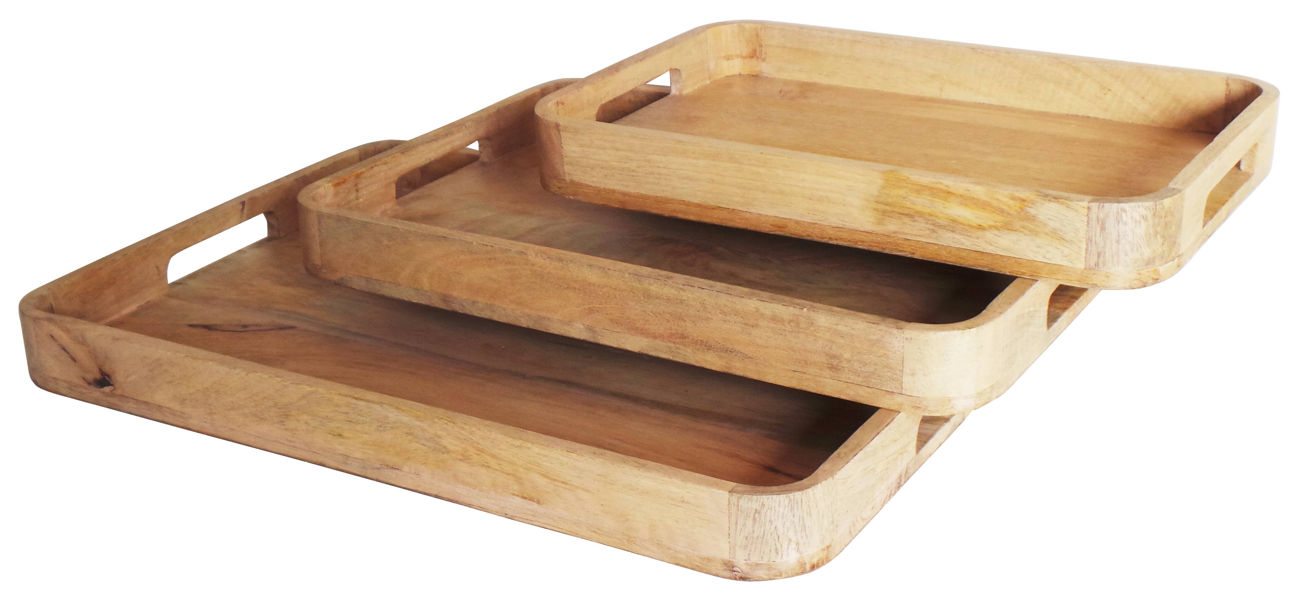 Набор из трёх подносов изготовлен из массива манго с ручной обработкой и натуральным оттенком дерева. Прочная конструкция подходит для сервировки и декорирования.