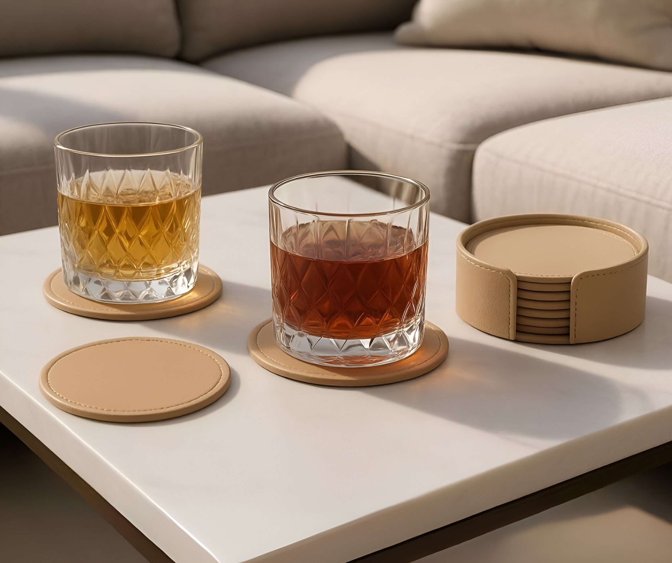 Набор подставок с отделкой из кожи и водоотталкивающей тканью. Используемые материалы обеспечивают износостойкость и аккуратный внешний вид.