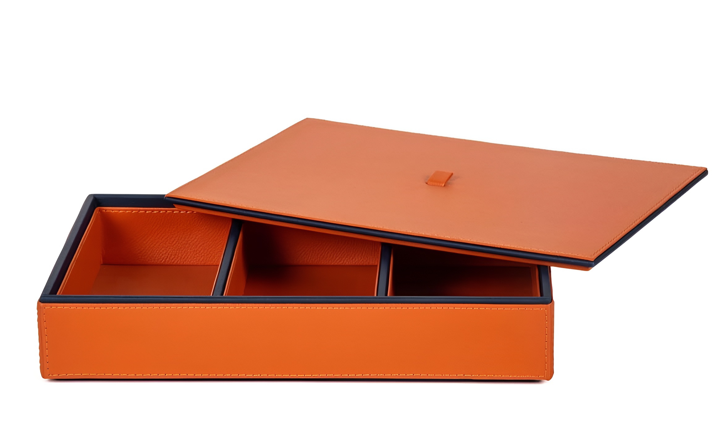 Коробка для хранения с отделкой из кожи и бархатными элементами. Используемые материалы обеспечивают аккуратный внешний вид и удобство хранения.